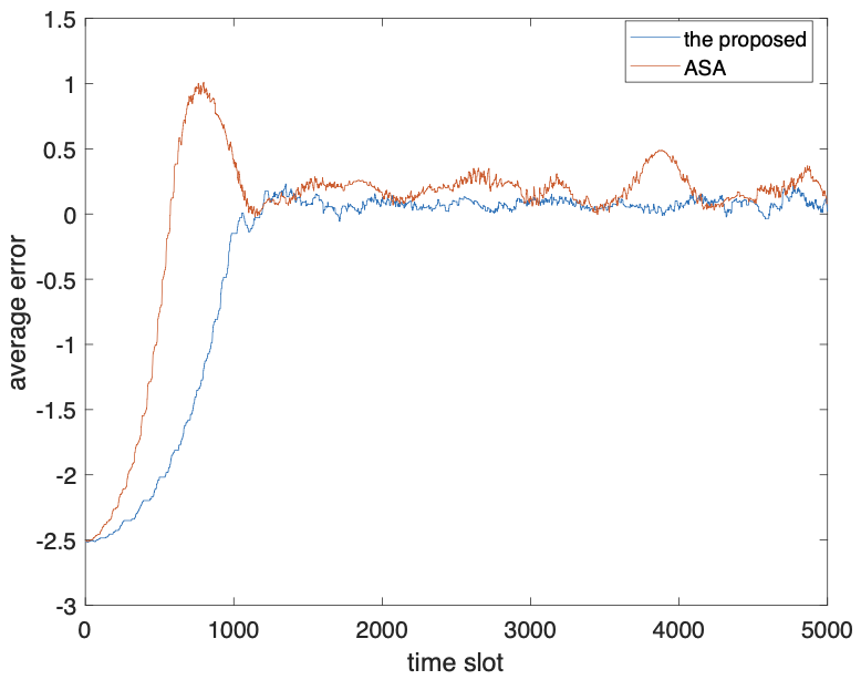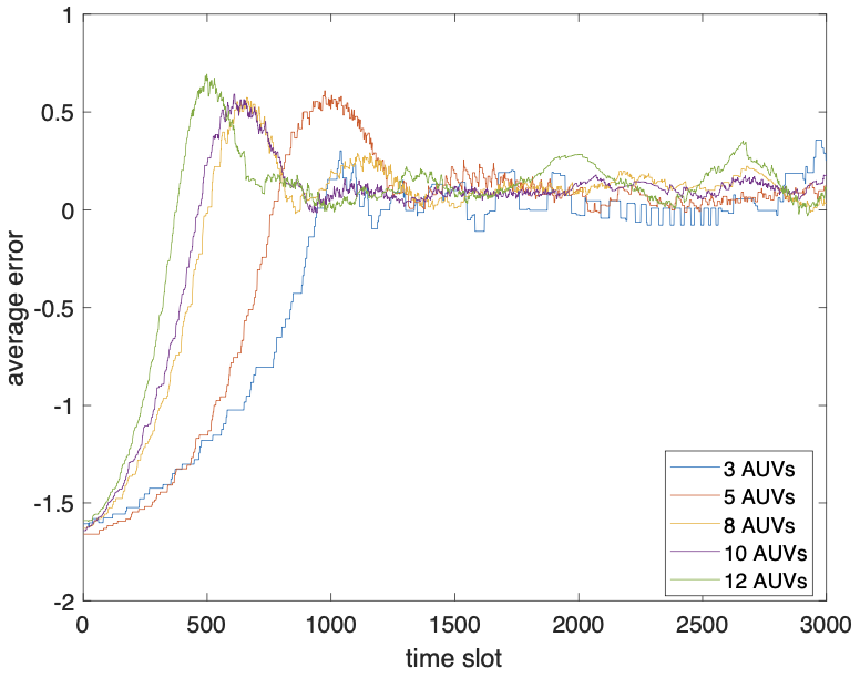 本文中提到的检测误差是指由公式计算出来的浓度值与目标浓度值4之间的误差。图6a中给出了在不同SDN-AUVNS的规模时的测试误差结果 (即n分别指定为3,5,8,10和12)。在1000时隙之前,误差非常大 (即图6a中的结果的绝对值)。这是因为SDN-AUVNS从范围从0 m到2m的位置开始追踪。图6a中的极值点表示图4f所示的阶段,其中由SDN-AUVNS检测到的浓度值大于目标浓度值并且将其检测/巡航转向浓度降低的方向。从图6可以看到误差在1200时隙之后易于稳定。这表明本文提出的跟踪方法是精确且稳定的。此外,可以得出n的值越大,误差越早稳定。这表明大型SDN-AUVNS可以促进水下污染跟踪。