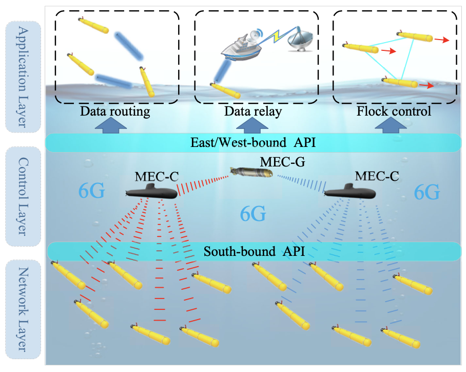 在应用层,水下探索和跟踪策略(如AUV集群的控制、AUV集群与控制中心之间的数据中继、数据路由等。)由南向接口部署。