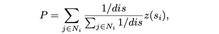 其中P表示根据距离倒数加权计算的加权和,可以表示为: