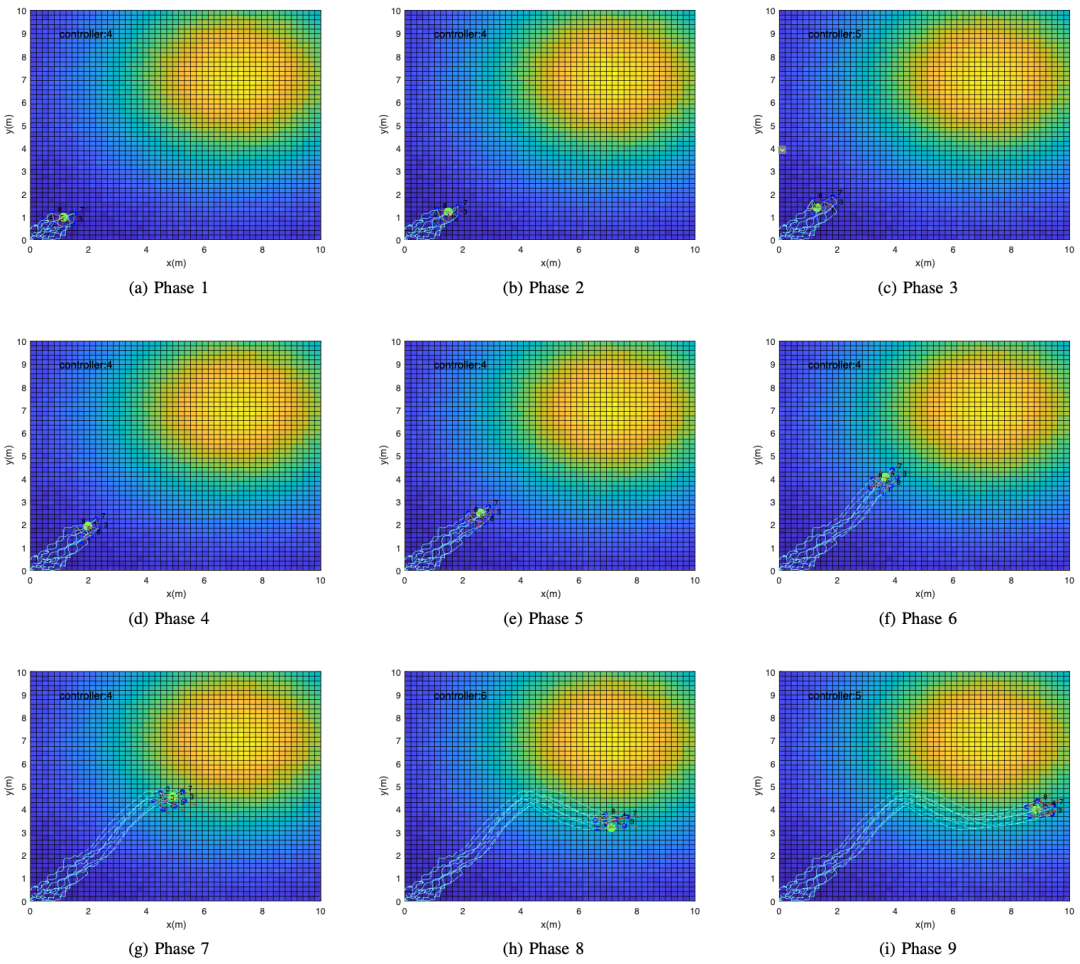 图 4a显示了基于SDN-AUVNS的水下污染跟踪的初始阶段。MEC-C是标号为4的AUV。从图4中可以看出关键阶段是第7阶段,在阶段7中,SDN-AUVNS的MEC-C注意到检测到的浓度值大于目标浓度值4。因此,SDN-AUVNs的速度被调整/转向浓度降低的方向,这个阶段一直保持到第8阶段。在第8阶段,如图所示 4h,SDN-AUVNS探测目标浓度值并沿目标等位线巡航。之后,SDN-AUVNS继续跟踪目标等位线。从图4a至图 4i显示的结果可以证明文中提出的算法可以跟踪特定浓度的水下污染。
