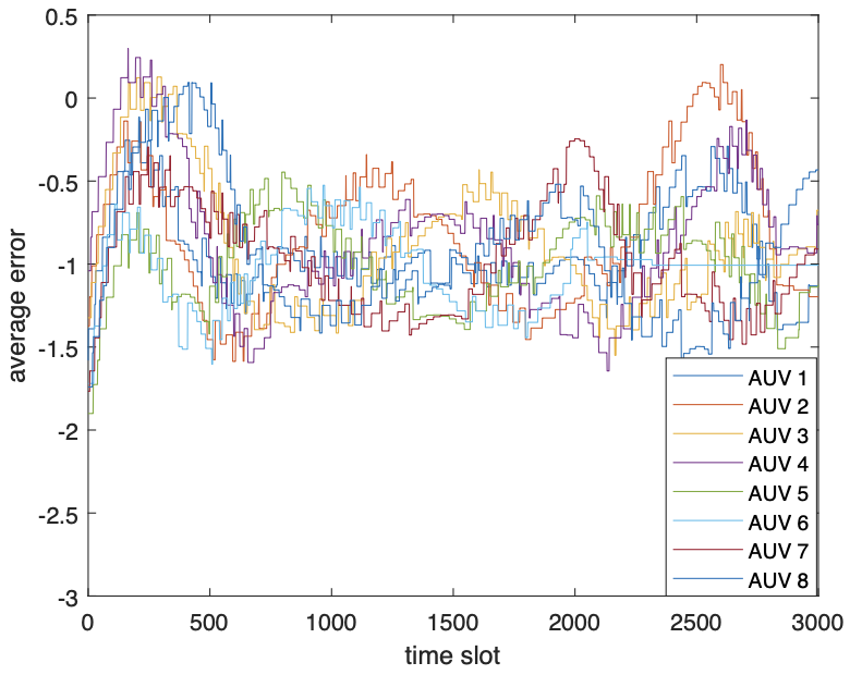 当SDN-AUVNS跟踪等势线时,计算每个AUV的平均检测误差,如图6所示 (AUV从AUV 1- AUV 8)。图6b测试一下结果与图4中的测试结果相似。开始时误差较大。当检测到目标等势线时,误差稳定。然而,从图8b中可以看到,当SDN-AUVNS以大幅度(例如,图6h中的阶段8) 转动时,误差也变大。