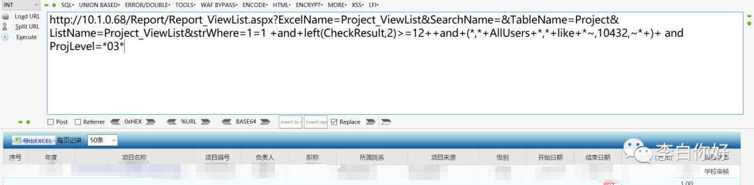 select xxxx from xxxx where 1=1 +and+left(CheckResult,2)>=12++and+(*,*+AllUsers+*,*+like+*~,10432,~*+)+ and ProjLevel=*03*