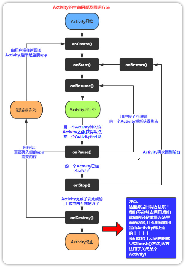| onCreat() | 一个Activity启动后第一个被调用的函数,常用来在此方法中进行Activity的一些初始化操作。例如创建View,绑定数据,注册监听,加载参数等。 |