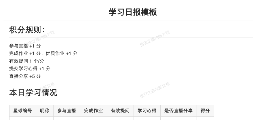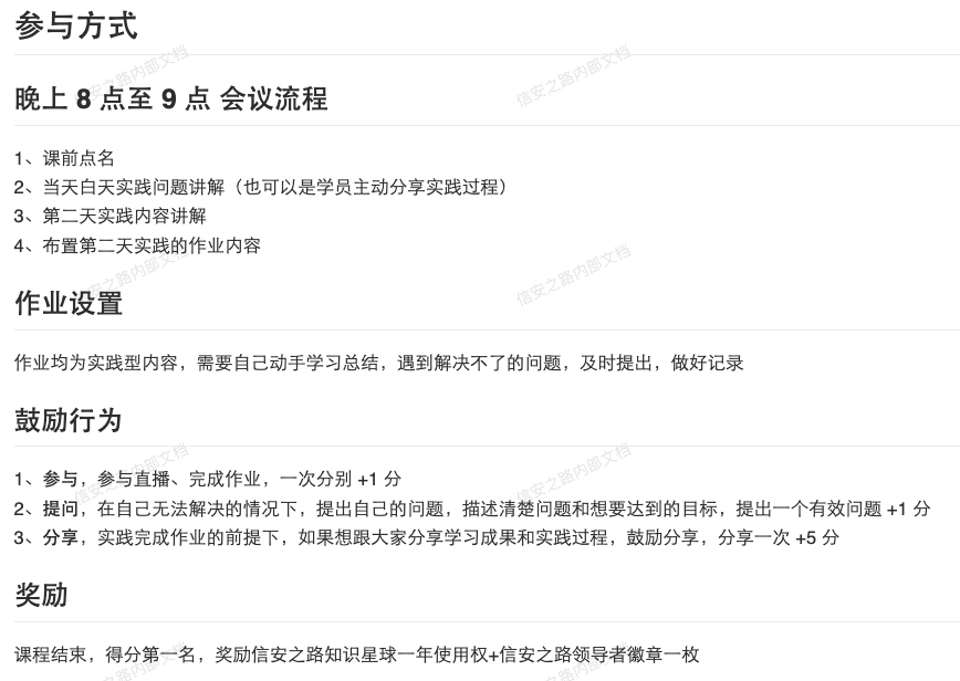 这次希望可以通过线上培训出线下的感觉,通过这次培训不仅学习到知识,而且需要学员间相互认识,了解,结交到志同道合的朋友,其次每天对于参加培训的同学进行点名签到,整理学员提出的问题,课程结束评选出最优秀的学员,给予奖励。