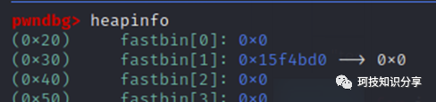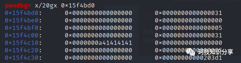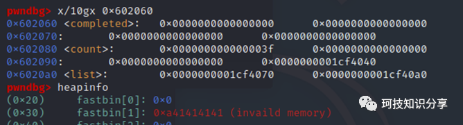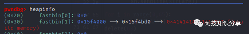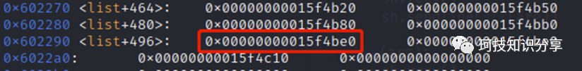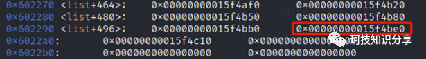 可以看到,0x15f4bd0已经被free进入fastbin,但list依旧记录着它(0x15f4be0,list实际记录的是字符串的位置,而chunk有size,所以实际位置会高16位)。