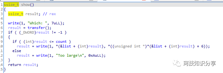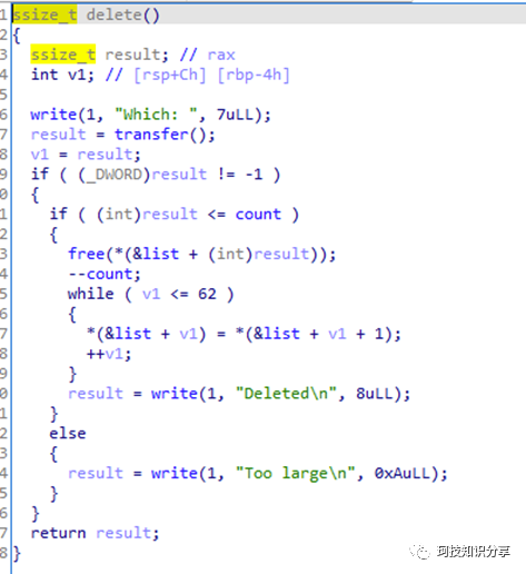 这里需要借助delete的两个漏洞,第一个是前后校验问题,在分析add()的时候,我们知道count最大为64,那么result <= count和v1 <= 62就存在校验不统一。