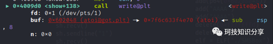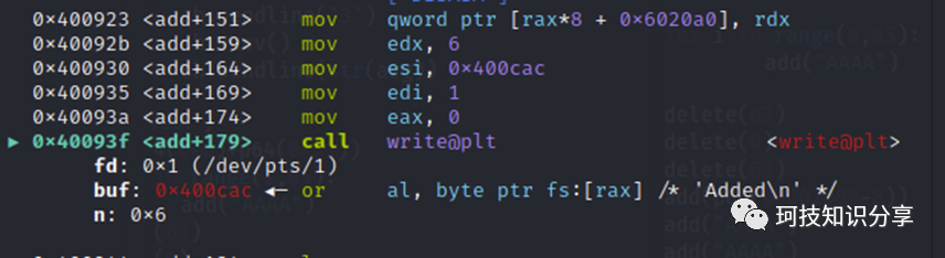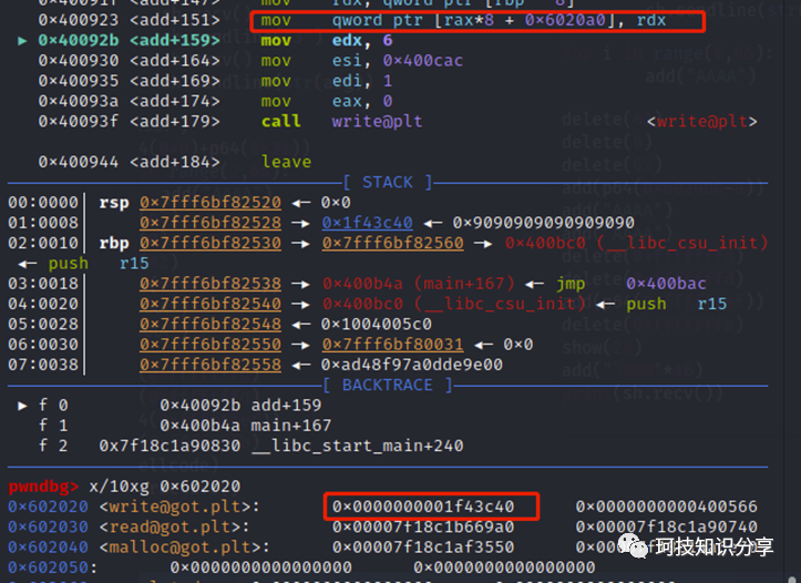 mov qword ptr [rax*8 + 0x6020a0], rdx即如下代码,这行汇编前,write_got正常。