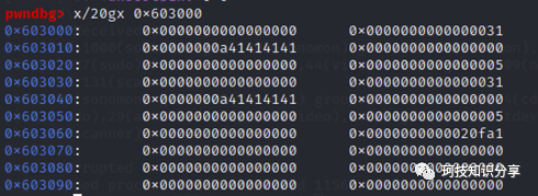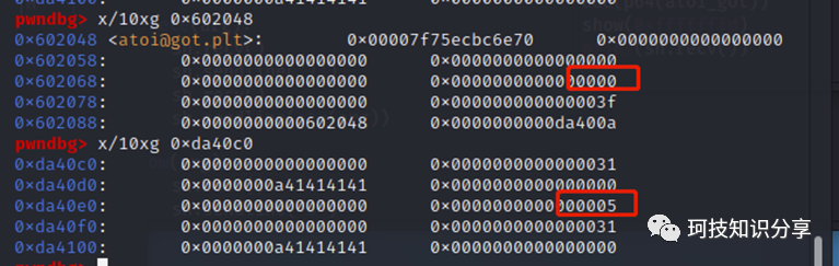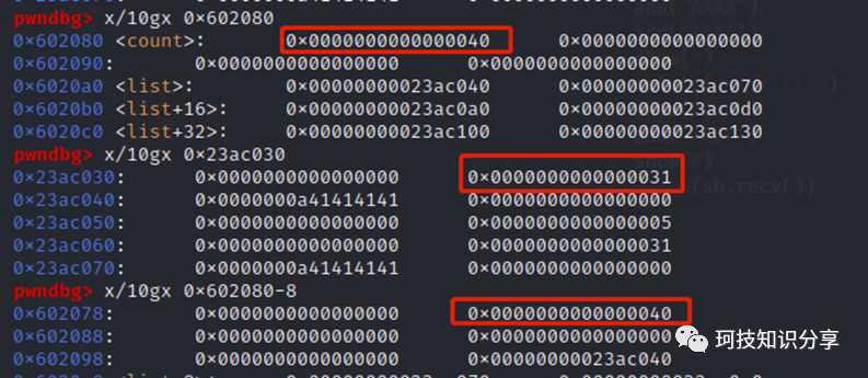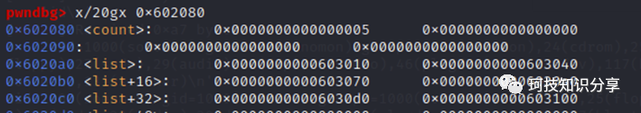 但不能直接add(p64(0x602080)),因为chunk size并不是在最开始的8位,而是后8位,如下图可得add(p64(0x602080-8))。