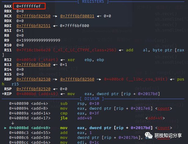 单步过程中盯着rax,这里可以看到count为0xffffffef。