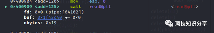 到read处,此时将输入的字符串(\x90)写入buf,也就是我们最后放shellcode的chunk。