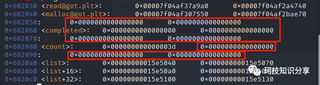 list记录buf指针时,是在list+count*8的位置记录,got地址刚好在list上方,离这段代码最近的的函数是write,那么想要劫持write就可以计算出count的数字。