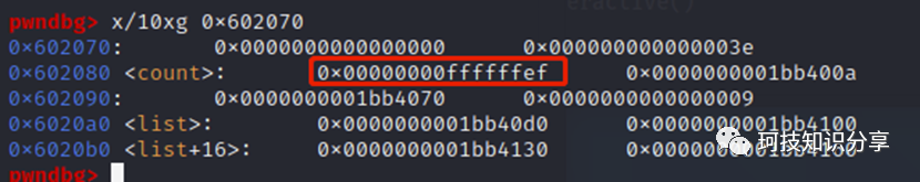 如何将count改写成0xffffffef呢?add(p64(0xffffffef));delete(0xfffffffb),这样就会将0xffffffef向上覆盖,覆盖到count位置,同时破坏了count和fake chunk。