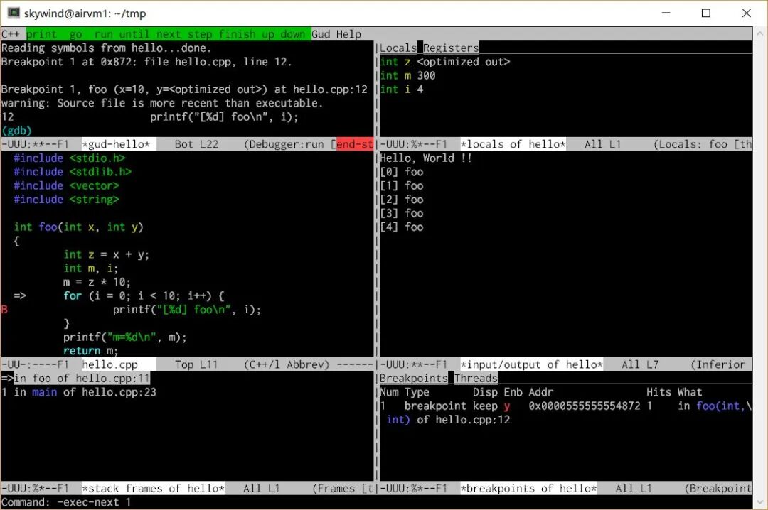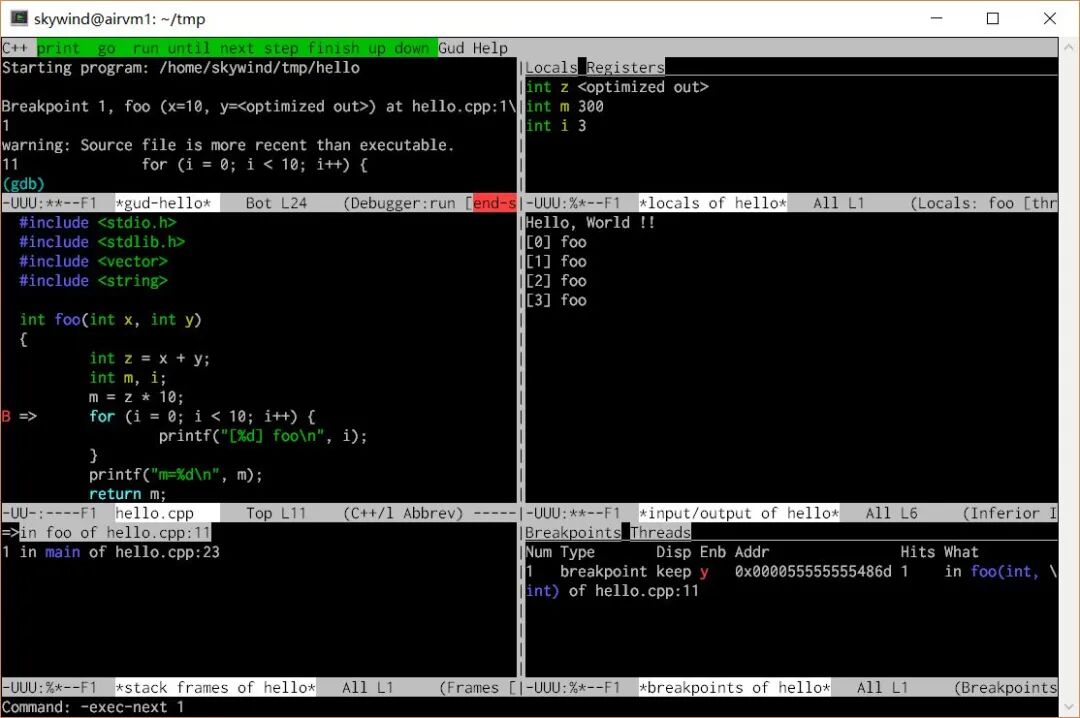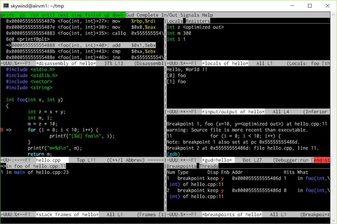 所有在调试一些相对复杂的问题时,上面这些工具 hold 不住了,作用平时 Vim 写代码的人,我也从不拒绝用 emacs 的 gdb mode 来调试一些复杂问题,毫无疑问 emacs 是目前终端下最强的 GDB 前端。