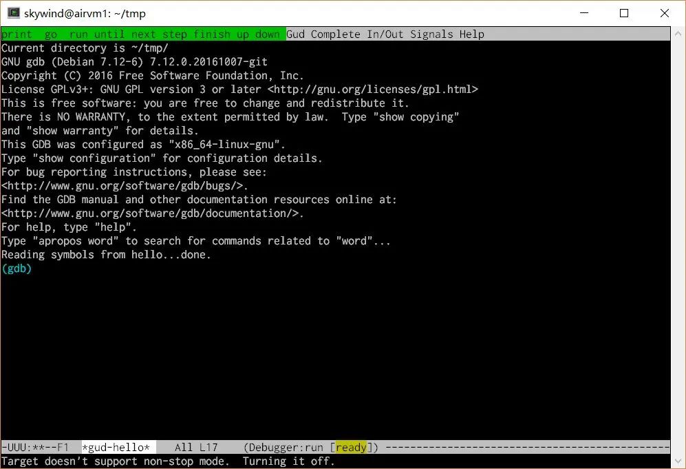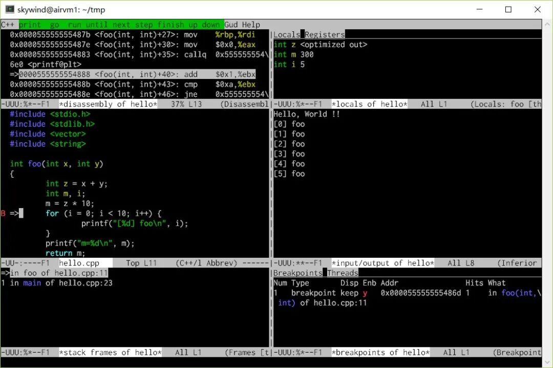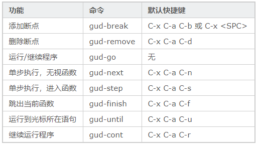 这些 gud- 开头的命令都是 emacs gdb-mode 下通用调试器的操作命令,他们和 gdb 命令一一对应,可以用 m-x 输入这些命令,还可以直接用快捷键操作。