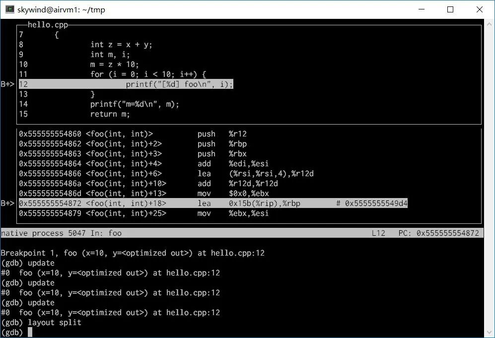 上方是源代码窗口,下面是 gdb 终端,窗口管理快捷键模仿 emacs,使用 c-x o 进行窗口切换,如果你还想查看指令窗口,可以输入:layout split