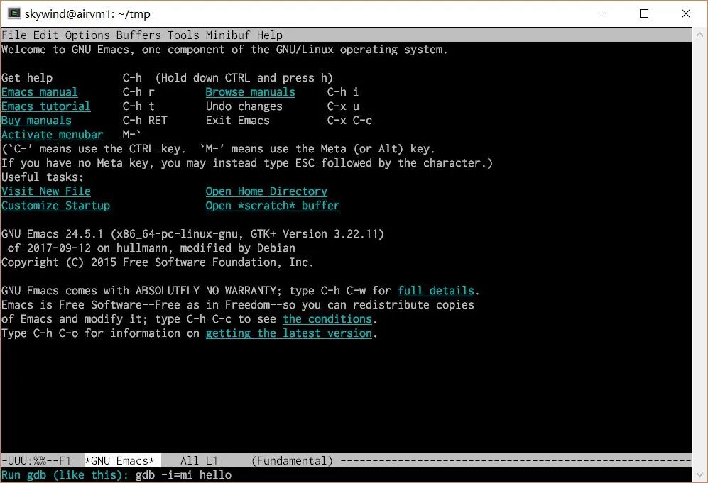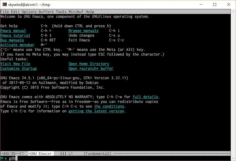 按下 m-x (alt+x),提示输入命令(如果终端软件 alt 键不灵,那可以设置一下终端软件,或者一秒内先按 ESC,再按 x键,在 xterm 终端下是等价的),键入 “gdb”敲回车: