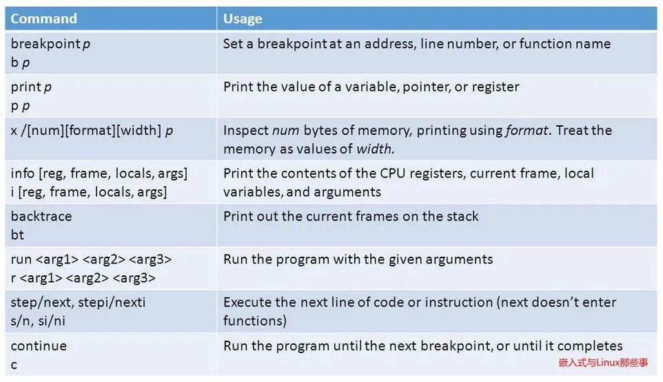 GDB命令密密麻麻,常用的也就表格上那几条,比如进去以后第一步先用 bt 查看一下调用栈,info local查看一下本地变量,再配合 up/down 在整个调用栈的不同层次之间上下移动一下,检查各处局部变量的值,print 一下某个表达式,即便没代码,看下符号和反汇编,一般也能调试个七七八八。