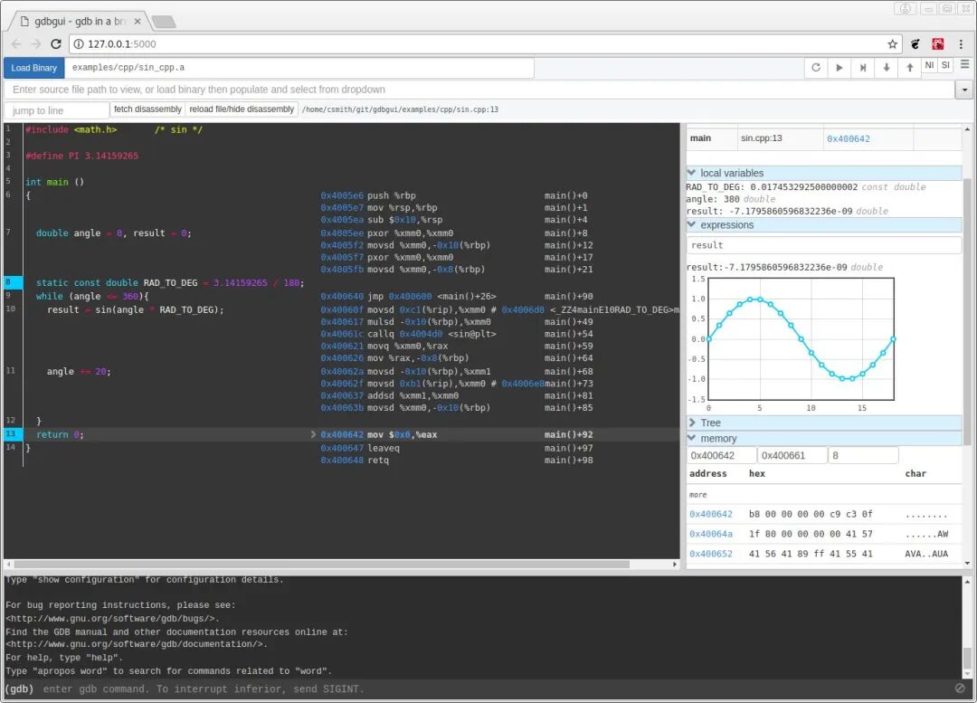 其实到 emacs 已经差不多了,但如果你实在记不住这有限的几个快捷键或者 gdb 命令,那么还可以尝试一下 gdbgui: