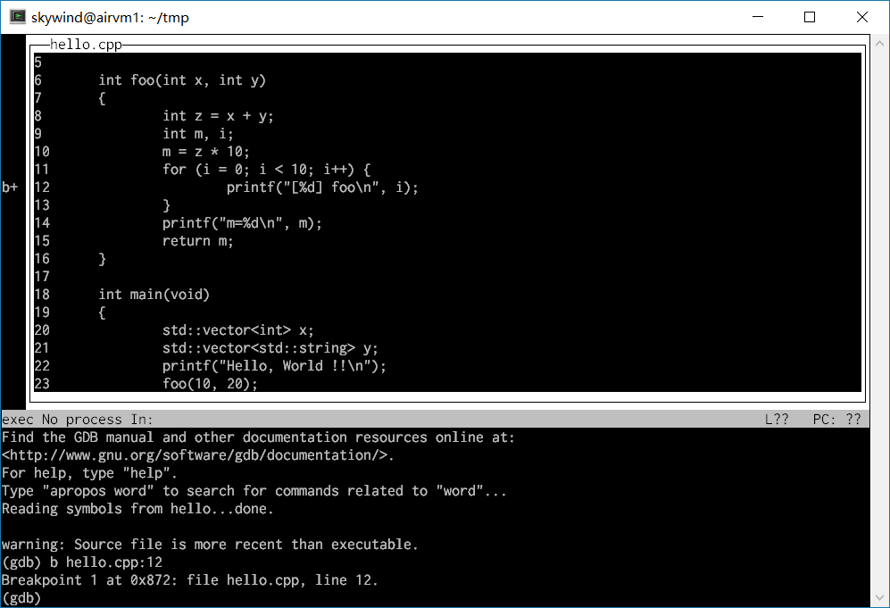 不过这个我用的并不多,因为它会影响 TUI 模式的界面,我不喜欢在我的 gdb 里搞太多乱七八糟的东西。同时,当我们的调试需求继续变得更加复杂,你要不停的断点,频繁的单步,这些传统命令行里不停的输入各种指令显然已经让我们疲惫不堪了,能否直接在界面上查看源代码并且直接在代码上快捷键断点,快捷键单步呢?