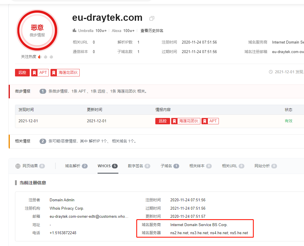 如:域名注册服务商“Internet Domain Service BS Corp.”、NS服务器“he.net”、IP服务器提供商“EstNOC OY”等。