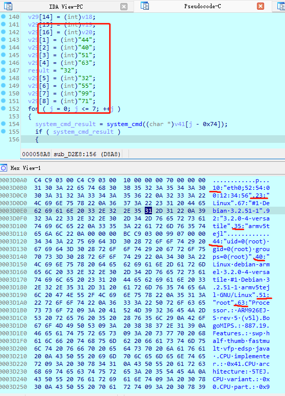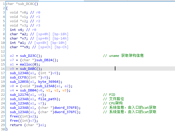5.通过cat XXXX命令获取系统信息,并且构造成特定格式,ID:“系统信息”,并且使用异或、字节变换等方法加密,之后在构造上线包中再次加密并发送,如下图: