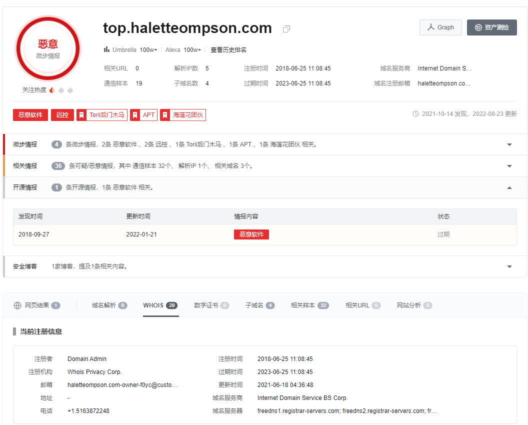 2.除此,国外安全厂商18年所披露的“top.haletteompson.com”域名解析的服务器依旧存活,域名注册时间长达5年。