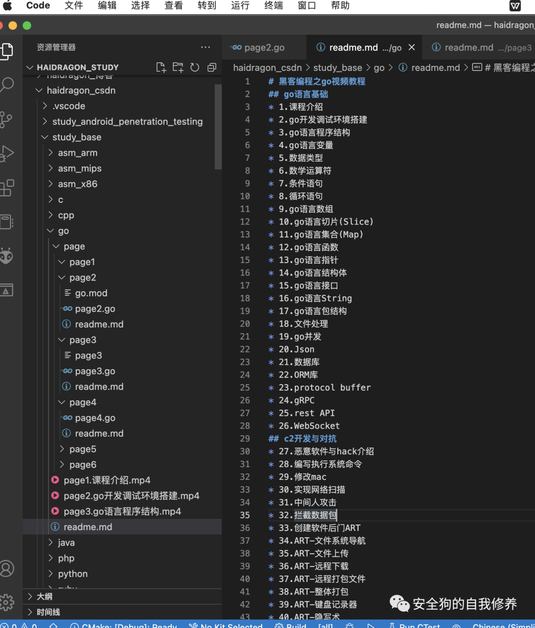 # hack安全编程之go视频教程## go语言基础* 1.课程介绍* 2.go开发调试环境搭建* 3.go语言程序结构* 4.go语言变量* 5.数据类型* 6.数学运算符* 7.条件语句* 8.循环语句* 9.go语言数组* 10.go语言切片(Slice)* 11.go语言集合(Map)* 12.go语言函数* 13.go语言指针* 14.go语言结构体* 15.go语言接口* 16.go语言String* 17.go语言包结构* 18.文件处理* 19.go并发* 20.Json* 21.数据库* 22.ORM库* 23.protocol buffer* 24.gRPC* 25.rest API* 26.WebSocket## c2开发与对抗* 27.恶意软件与hack介绍* 28.编写执行系统命令* 29.修改mac* 30.实现网络扫描* 31.中间人攻击* 32.拦截数据包* 33.创建软件后门ART* 34.ART-文件系统导航* 35.ART-文件上传* 36.ART-远程下载* 37.ART-远程打包文件* 38.ART-整体打包* 39.ART-键盘记录器* 40.ART-隐写术* 41.ART-自身保护* 42.其它ART技术* 43.对抗检测思路* 44.总结