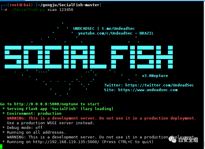 ./SocialFish.py bai 123456 后面第一个bai是用户名,123456是自己设置的密码