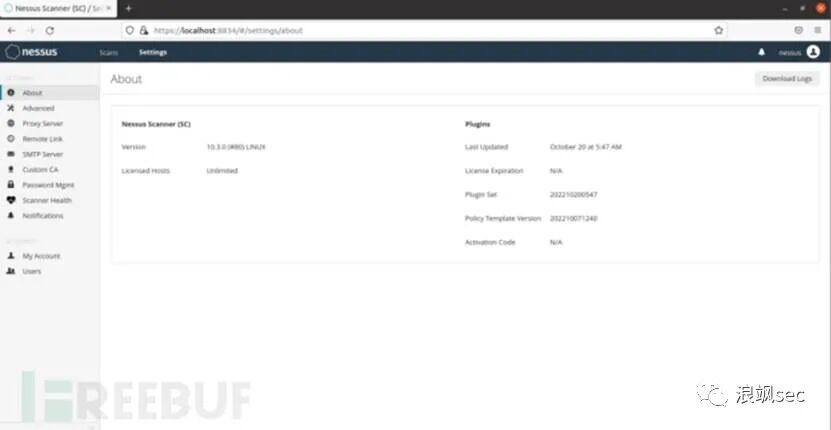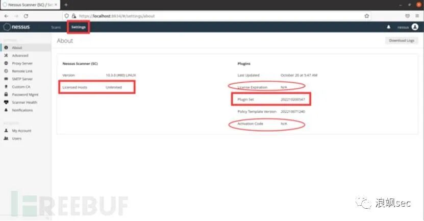 登录Nessus,在Settings中我们可以看到,IP数量限制已经被解除;虽然激活码为N/A,但可以看到,授权已经是无限期的了
