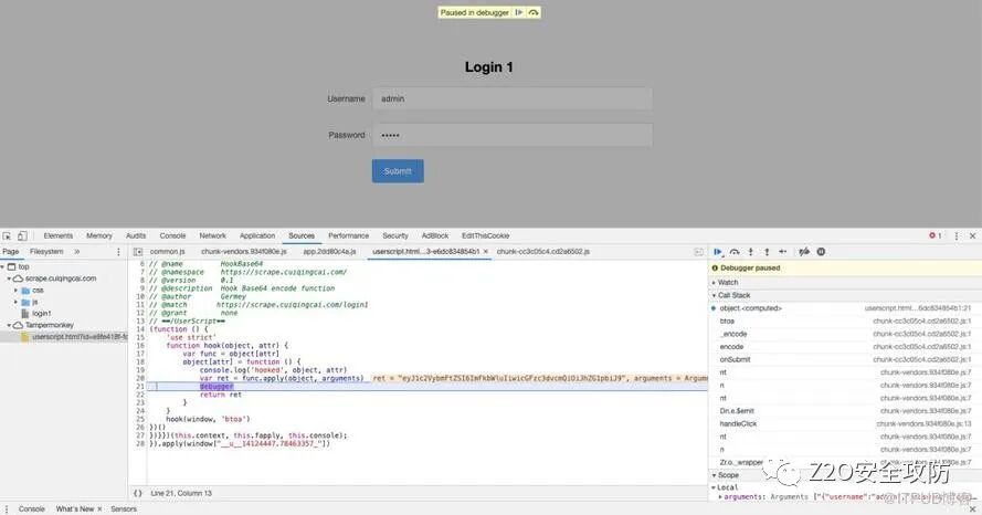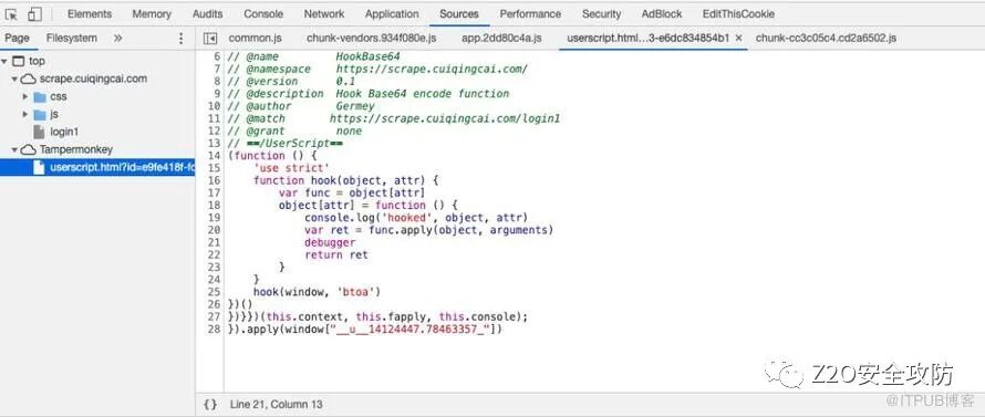 所以,这里介绍第二种可以快速定位入口的方法,那就是使用 Tampermonkey 自定义 JavaScript 实现某个 JavaScript 方法的 Hook。Hook 哪里呢?最明显的,Hook Base64 编码的位置就好了。