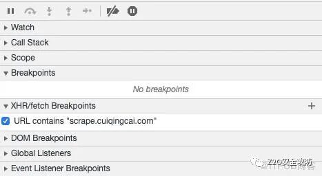 由于这个请求正好是一个 Ajax 请求,所以我们可以添加一个 XHR 断点监听,把 POST 的网址加到断点监听上面去,在 Sources 面板右侧添加这么一个 XHR 断点,如图所示: