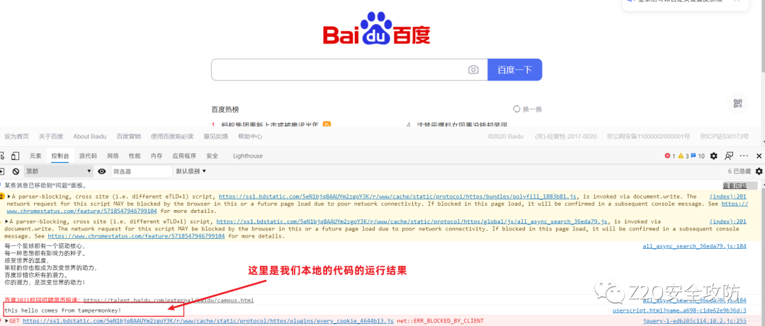 到此为止,你已经完成了本地开发脚本所需要配置的全部内容,接下来就可以在你要开发的对应页面进行脚本的开发了,这里以百度为例,比如此时我们代开百度页面,然后打开控制台,就会看到我们刚刚开发的代码的运行结果: