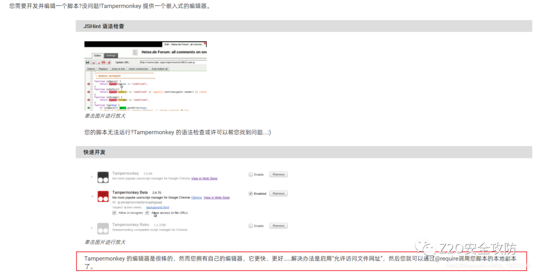 如上图所介绍的,我们只需要允许 Tampermonkey 插件访问文件网址即可实现本地 js 文件的访问了,然后再通过 @require 引入后,即可实现本地的插件开发了.这里详细介绍一下具体过程.