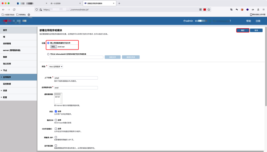 先将冰蝎jsp马在本地打包成war包,打包命令jar -cvf shell.war shell.jsp,然后在如下图中位置上传war包并进行部署