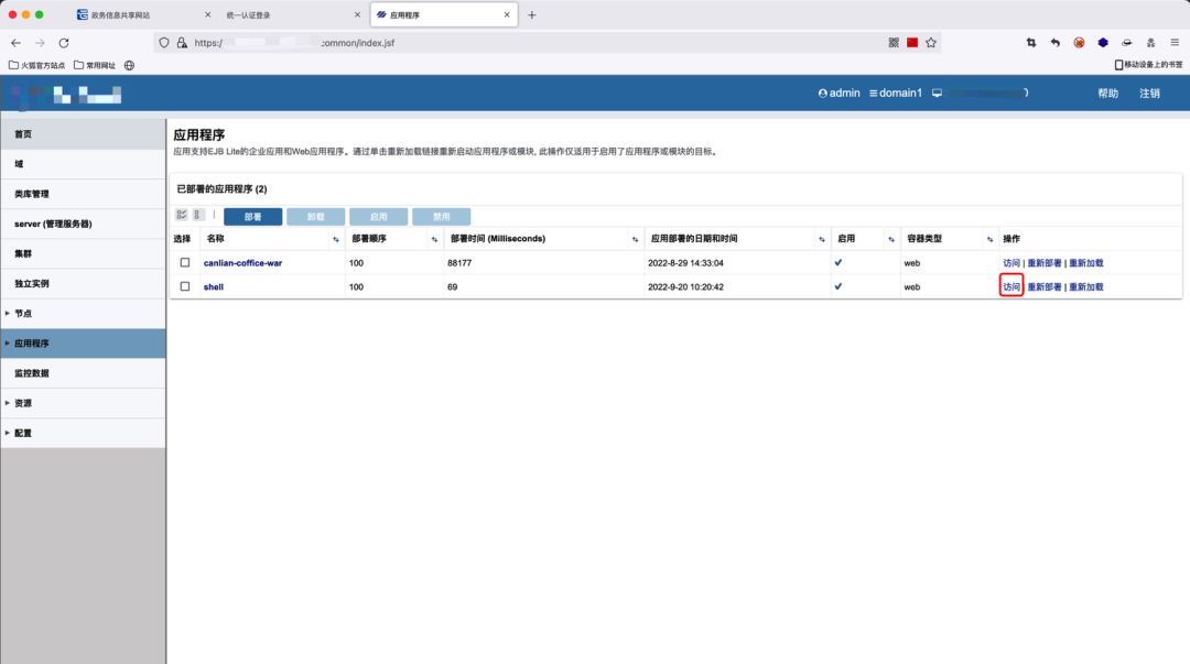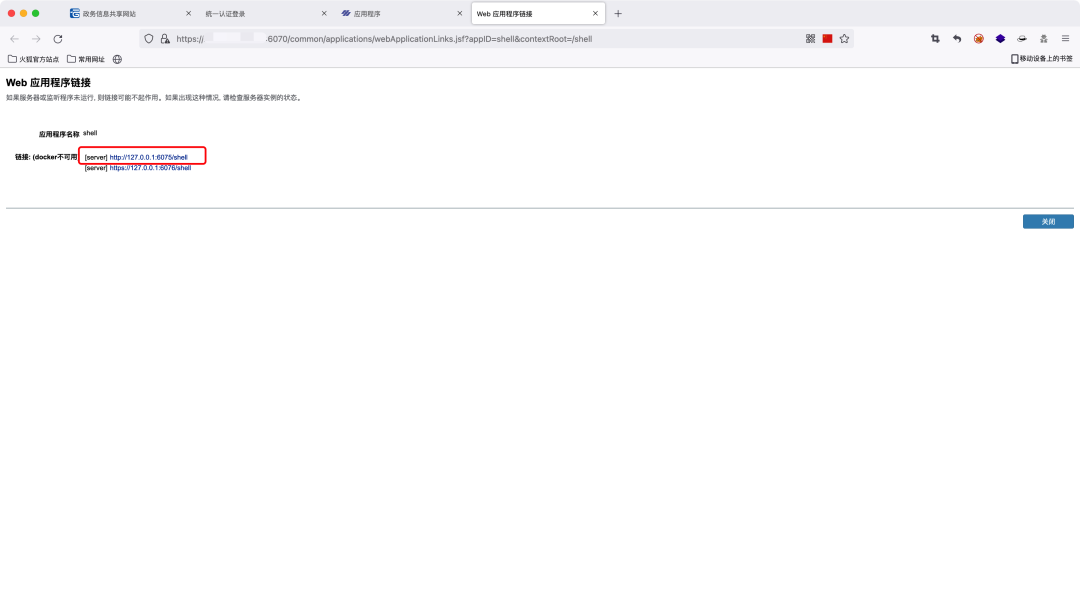 点击访问后系统跳转到下图页面,页面中给出了一个内网地址,通过改地址我们是无法访问shell的,在下图的地址中我们获取到了路径和端口,使用站点地址的域名或ip在部署后下图页面提示的端口路径下访问shell.jsp即为冰蝎的shell地址路径。