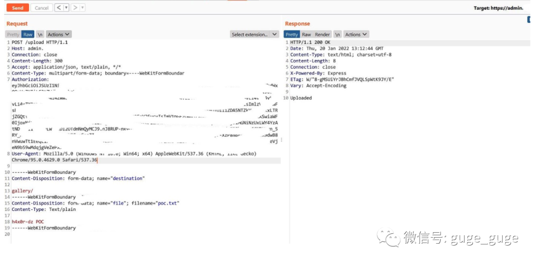 POST /upload HTTP/1.1Host: admin.test.comConnection: closeContent-Length: 300Accept: application/json, text/plain, */*Content-Type: multipart/form-data; boundary=----WebKitFormBoundarypxxxxxxAuthorization: <JWT>User-Agent: Mozilla/5.0 (Windows NT 10.0; Win64; x64) AppleWebKit/537.36 (KHTML, like Gecko) Chrome/95.0.4629.0 Safari/537.36------WebKitFormBoundarypxxxxxxContent-Disposition: form-data; name="destination"gallery/------WebKitFormBoundarypxxxxxxContent-Disposition: form-data; name="file"; filename="poc.txt"Content-Type: Text/plainh4x0r-dz POC------WebKitFormBoundarypxxxxxx--