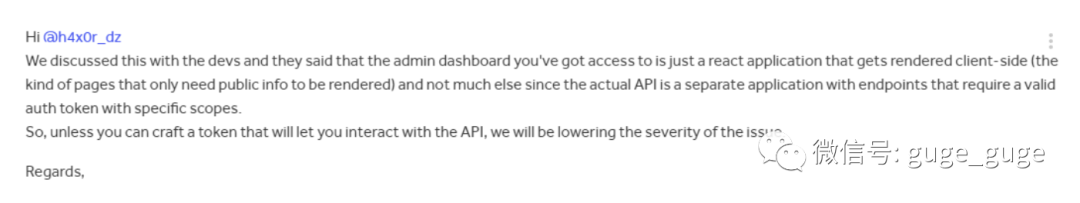 我们与开发人员就该漏洞进行了讨论,他们说你可以访问的管理面板只是一个在客户端呈现的应用程序(只需要呈现公共信息的那种页面),实际的 API 是一个单独的应用程序,其端点需要具有特定范围的有效身份验证令牌,因此,除非你可以制作一个与 API 交互的令牌,否则我们会降低该漏洞的严重性。