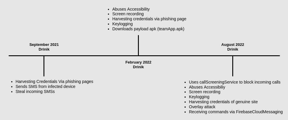 最近,研究人员发现了一个升级版的Drinik,它冒充印度所得税部门并再次针对18家印度银行发起攻击。Drinik恶意软件的早期变种于2016年作为SMS窃取程序首次被发现。大约在2021年8月,该恶意软件再次活跃并演变为Android银行木马。2021年9月,该应用程序通过网络钓鱼活动窃取了印度纳税人个人身份信息 (PII) 和银行凭证。