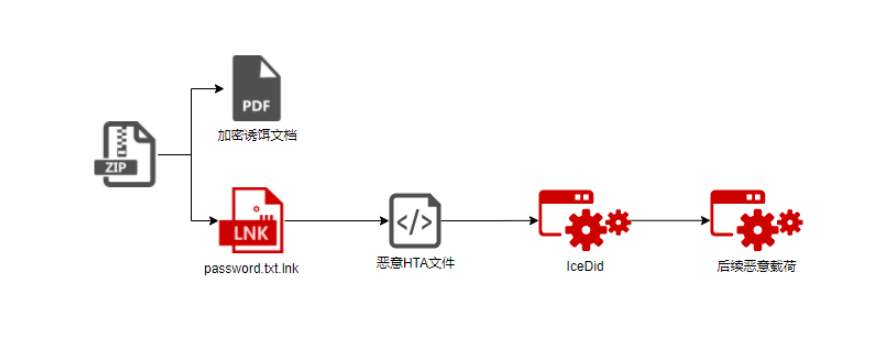 研究人员近期捕获了一些由黑产团伙发起的类似的攻击活动。攻击者模仿APT-C-26(Lazarus)组织下发加密PDF文档作为诱饵和具有诱惑性名称的LNK恶意文件手法,而且攻击链在初始访问和执行阶段的手法和Lazarus组织的DangerousPassword攻击活动手法非常相似,但其下发的恶意载荷是目前流行的恶意程序,甚至是公开发售的程序,例如IceDid或挖矿木马等。此外在公开威胁情报中也表明IceDid也会利用LNK、powershell和mshta等恶意荷载发起攻击。目前这些模仿DangerousPassword攻击活动手法的“案例”没有归属到任何APT组织,其更像黑产团伙所为。