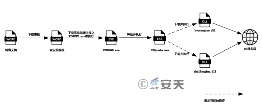 攻击者首先采用恶意模板注入的方式,等待诱饵文档被目标用户打开并下载到受害者主机。然后模板中的宏代码通过请求指定的URL以下载恶意载荷并将其注入到WINWORD.exe中执行。接着,恶意载荷释放并执行下载工具IEUpdate.exe,以及将其添加至注册表RUN中实现持久化。最后,IEUpdate.exe发送消息以获取后续通信使用的C2,再根据回传的信息下载执行不同恶意载荷。目前已知存在hvncengine.dll和shellengine.dll两种载荷,均用于与C2通信以实现远程控制。