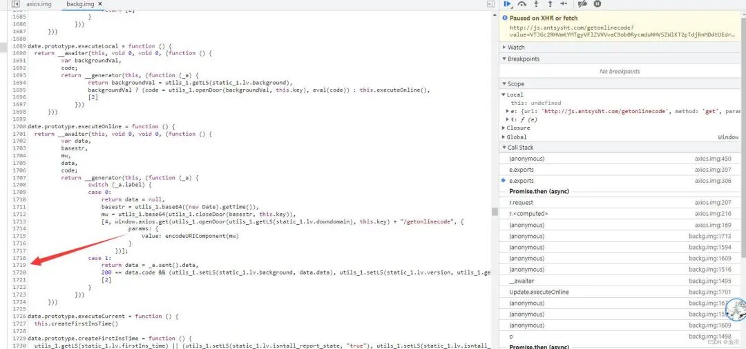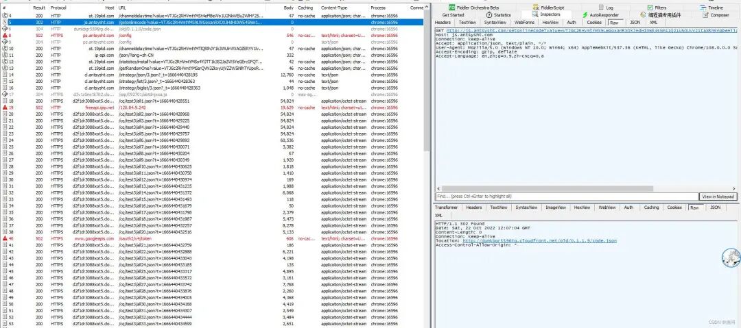 接着是一个【getonlinecode】的api,从名称上可以猜测,很有可能是加载在线的恶意js,并且这是一个302的响应码,跳转到路径【/old/0.1.1.9/code.json】的一个文件,里面是一个加密了的文件,那么只能动态调试分析了。