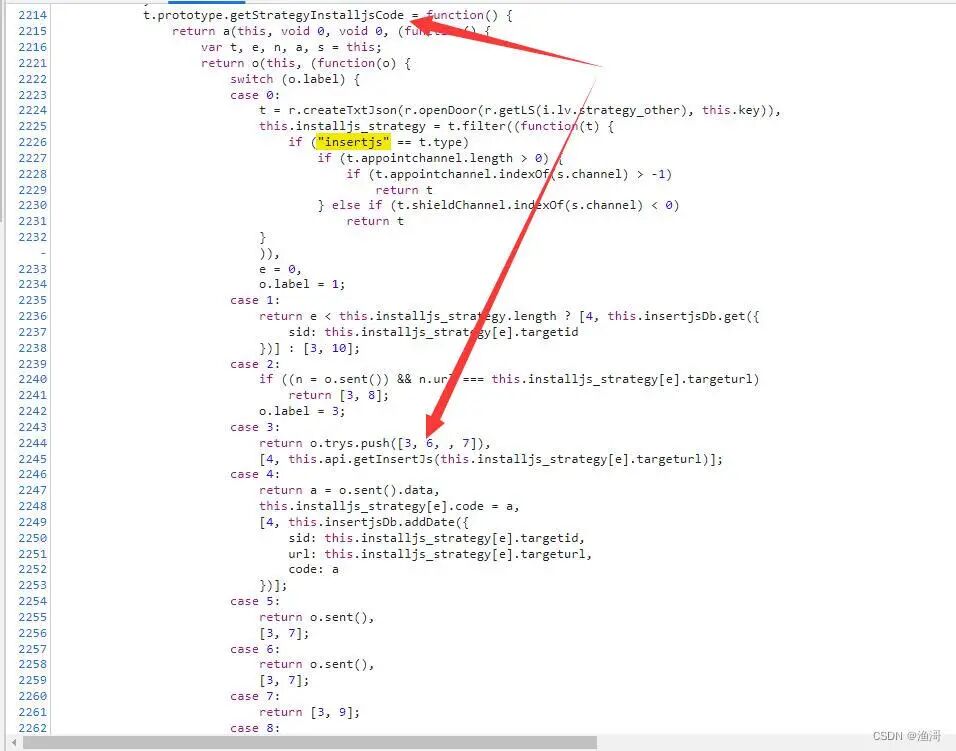 发现是在getStrategyInstalljsCode函数里面,然后调用了getInsertJs来加载js代码。为了方便调试,使用mitmproxy来注入js,在两个js的开头处加入debugger,相关内容可以查看帖子某数和某5秒-反混淆动态注入调试的一种方案