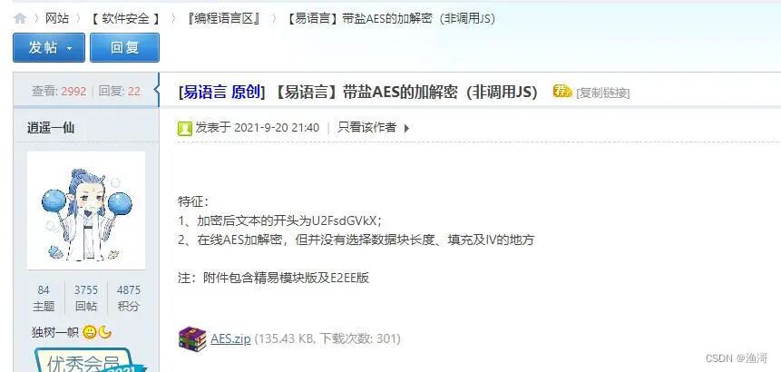 根据逍遥一仙的文章【易语言】带盐AES的加解密(非调用JS),这里有易语言模块