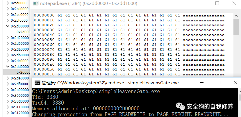 查看一个32位进程模块列表,其中有前面提到了3个wow64接口dll,并且存在俩个NTDLL.dll,其中之一位于64位地址空间中。