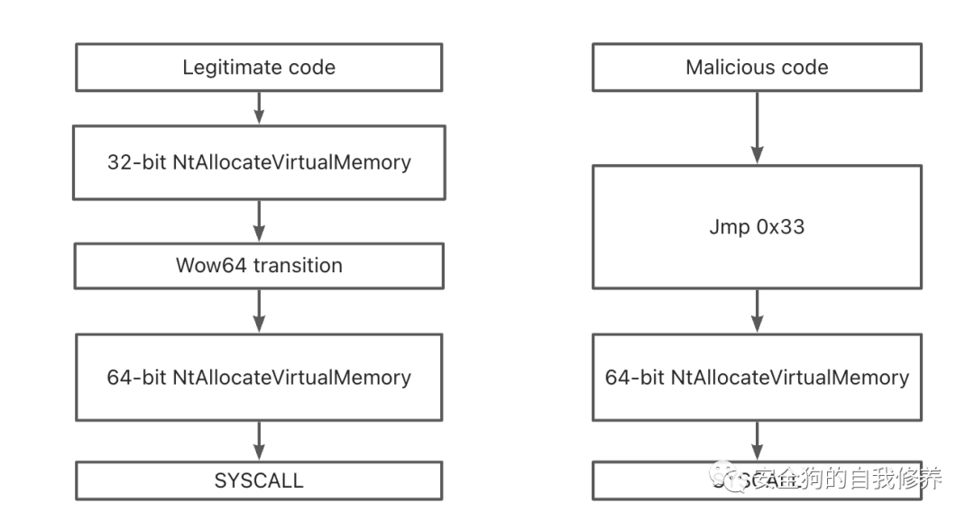 查找NTDLL中64位API函数的地址并跳转到它,不经过32位NTDLL