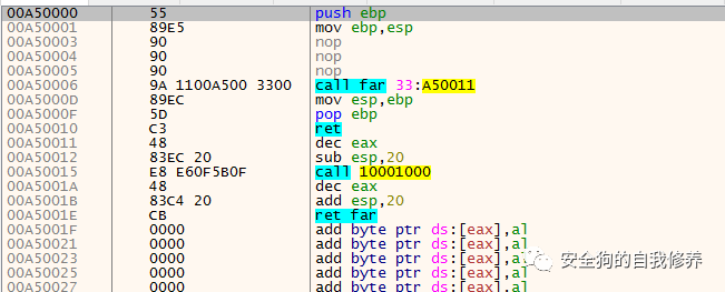 这里call far 33:xxxx,使处理器切换到x64。从这里开始,我们可以与64位函数通信并执行syscall。