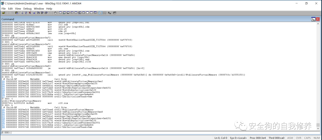 0:000> tntdll!NtAllocateVirtualMemory:00007ffc`b1555150 4c8bd1 mov r10,rcx0:000> k# Child-SP RetAddr Call Site00 00000000`0009e5f8 00000000`6e976ae8 ntdll!NtAllocateVirtualMemory01 00000000`0009e600 00000000`6e976ea5 wow64!whNtAllocateVirtualMemory+0xa802 00000000`0009e6b0 00000000`6e961cf7 wow64!Wow64SystemServiceEx+0x15503 00000000`0009ef70 00000000`6e98bfa1 wow64cpu!ServiceNoTurbo+0xb04 00000000`0009f020 00000000`6e97cbb0 wow64!Wow64KiUserCallbackDispatcher+0x415105 00000000`0009f0a0 00007ffc`b1541791 wow64!Wow64LdrpInitialize+0x12006 00000000`0009f350 00007ffc`b1577b28 ntdll!LdrpInitializeProcess+0x155107 00000000`0009f750 00007ffc`b1528d6e ntdll!_LdrpInitialize+0x4ed6408 00000000`0009f7d0 00000000`00000000 ntdll!LdrInitializeThunk+0xe